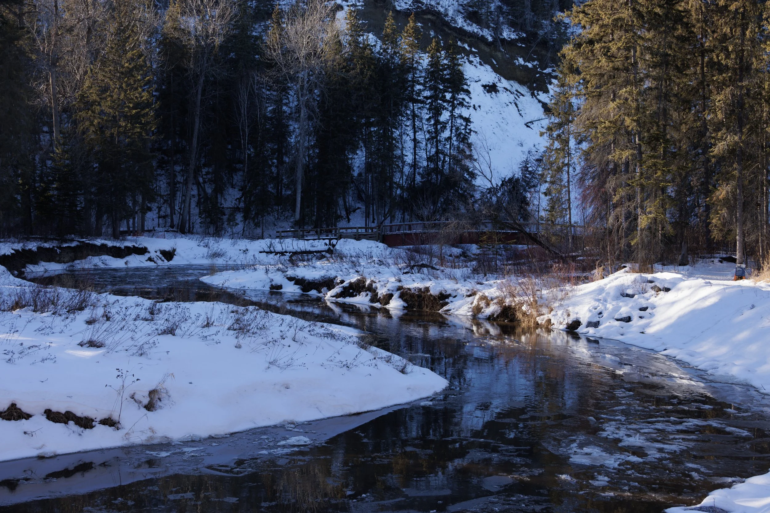 The crisp, frigid air bites gently at your cheeks, instantly awakening your senses as you step into the profound, heavy silence of the snow-covered landscape. Stripped of their summer canopy, the surrounding trees reveal their stark, beautiful architecture, inviting you to slow down and witness the forest's quiet dormancy.